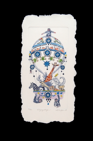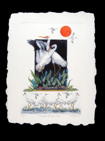 Kathy creates her etchings by etching the design into the metal plate with nitric acid. After wiping off the excess ink with a cloth, she prints them on her etching press.